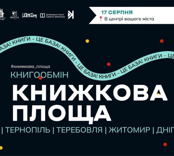 З 2 червня по 11 серпня у Дніпрі працюють точки збору книг у рамках проєкту «Книжкова площа» – великого книгообміну, що має за мету об’єднати читачів усього міста. Для того, щоб обміняти прочитані книги на «нові», треба обрати зручну локацію, принести книжки та отримати спеціальний квиток: на ньому буде зазначено, скільки книг можна власне обміняти 17 серпня на головній локації у центрі міста.