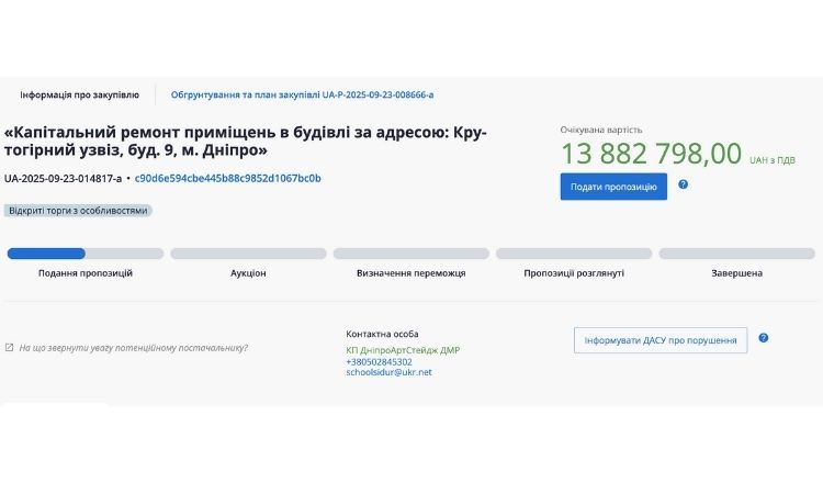 Комунальне підприємство «ДніпроАртСтейдж» Дніпровської міської ради оголосило про проведення капітального ремонту приміщень в будівлі за адресою Крутогірний узвіз, буд. 9, м. Дніпро. Очікувана вартість становить 13 882 798,00 грн.