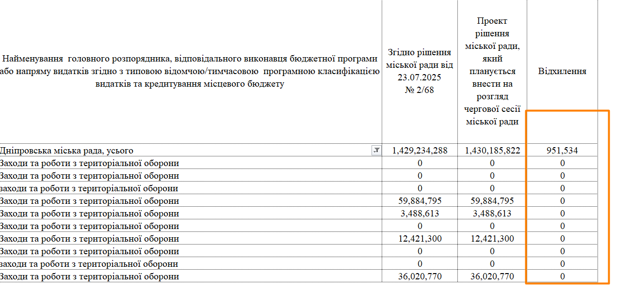 У проєкті оновленого бюджету Дніпровської міської ради на серпень 2025 року не передбачено додаткового фінансування на заходи та роботи з територіальної оборони. Усі суми залишились на рівні попереднього рішення — 111,8 млн грн