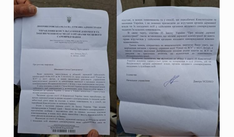 У листі зазначалося, що «вирішення питання щодо сприяння акції «Гроші на ЗСУ» у місті Дніпро, а також щодо виділення міськради Дніпра грошей на ЗСУ за рахунок не критичних видатків, не відноситься до повноважень ОДА».