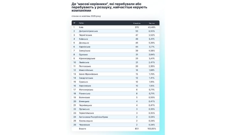 Майже половина ймовірних «масових керівників», які перебували чи перебувають у розшуку, керують компаніями в Києві — це 370 бізнесів, або 43% від загальної кількості.