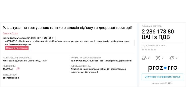 Комунальне некомерційне підприємство «Зеленодольський центр первинної медико-санітарної допомоги» Зеленодольської міської ради оголосило тендер на улаштування тротуарною плиткою шляхів під’їзду та дворової території. Очікувана вартість — 2 286 178,80 грн.