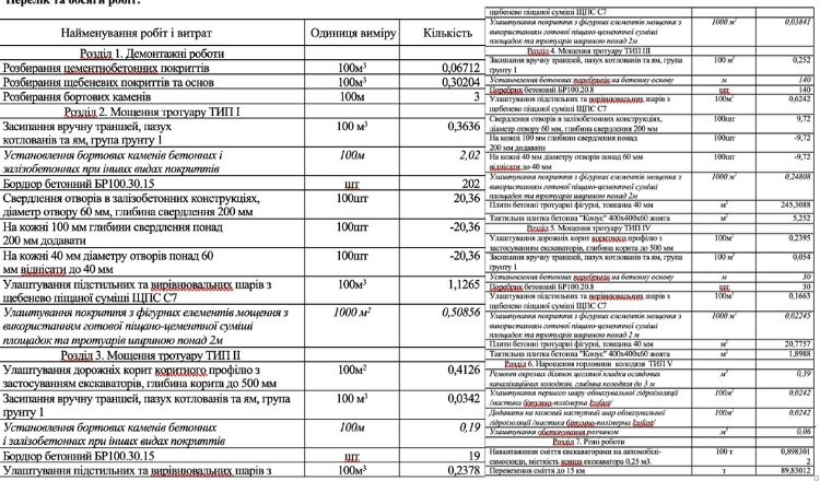 - установлення бортових каменів бетонних і залізобетонних (свердлення отворів в залізобетонних конструкціях, улаштування підстильних та вирівнювальних шарів з щебенево піщаної суміші);