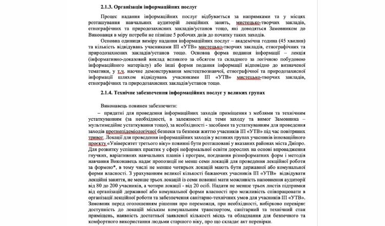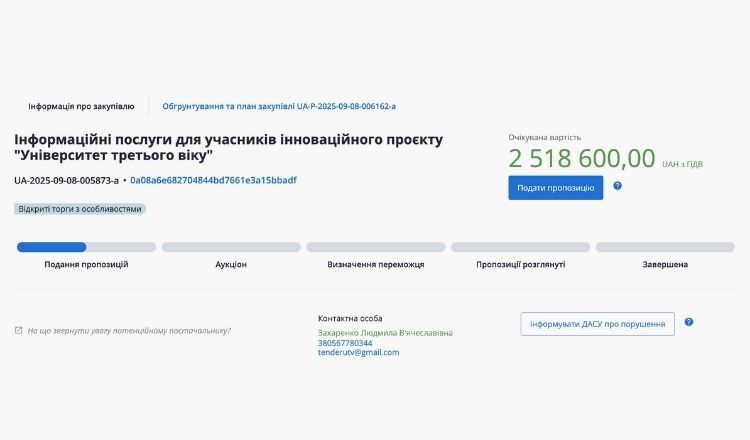 Управління з питань реалізації інноваційного проєкту «УТВ» Дніпровської міськради оголосило тендер на 2,5 млн грн на «Інформаційні послуги для учасників інноваційного проєкту «Університет третього віку». Термін надання послуг — до 31 грудня 2025 року.