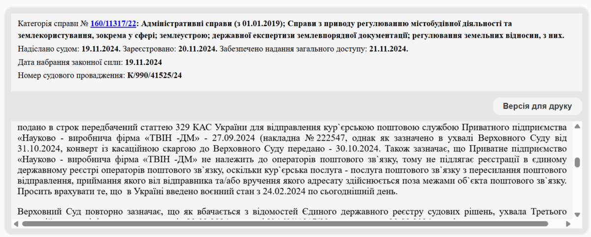 Натомість згідно з ухвалою Верховного Суду від 31.10.2024 приватне підприємство «Науково-виробнича фірма «ТВІН-ДМ» не належить до операторів поштового зв’язку.