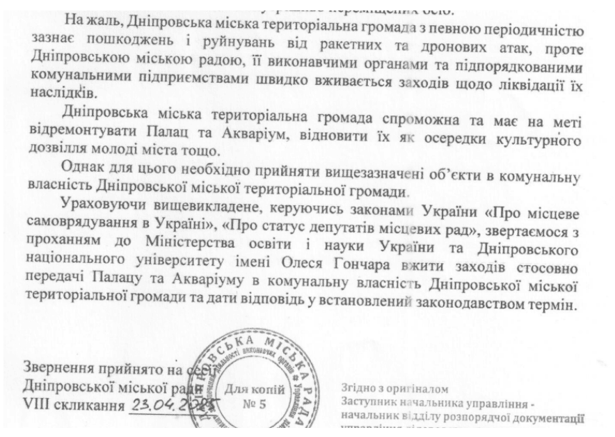 23 квітня на 65-й сесії міськради депутатами було прийнято рішення направити звернення до Міністерства освіти і науки та ДНУ з текстом зазначеному в пункті 1 рішення (фото). У додатку до рішення було зазначено, що в Державному реєстрі речових прав на нерухоме майно відсутня інформація, що Палац та Акваріум знаходяться на балансі університету. Жодної інформації про надання субвенції закладу вищої освіти в додатку не було.