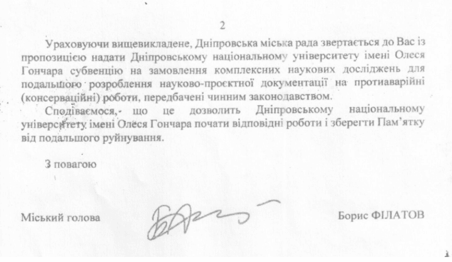 Натомість у листі ректору Сергію Оковитому від 22 квітня Борис Філатов пропонує надати субвенцію на проведення комплексних наукових досліджень для подальшого розроблення документації на протиаварійні (консерваційні) роботи.