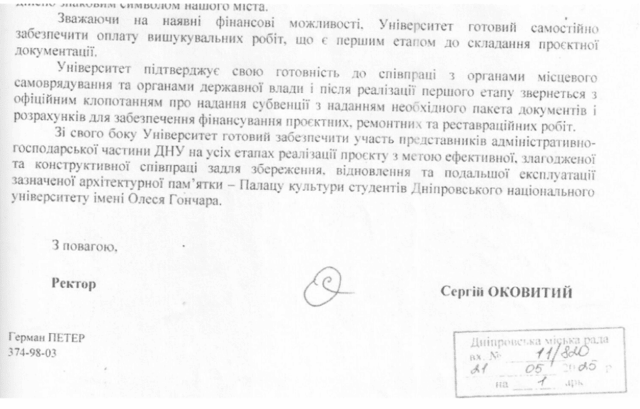 Ректор Сергій Оковитий надіслав відповідь на лист про надання субвенції 20 травня, перед 66-ю сесією міськради, на якій був присутній представник університету, проректор з правових питань та розвитку ДНУ Герман Петер.