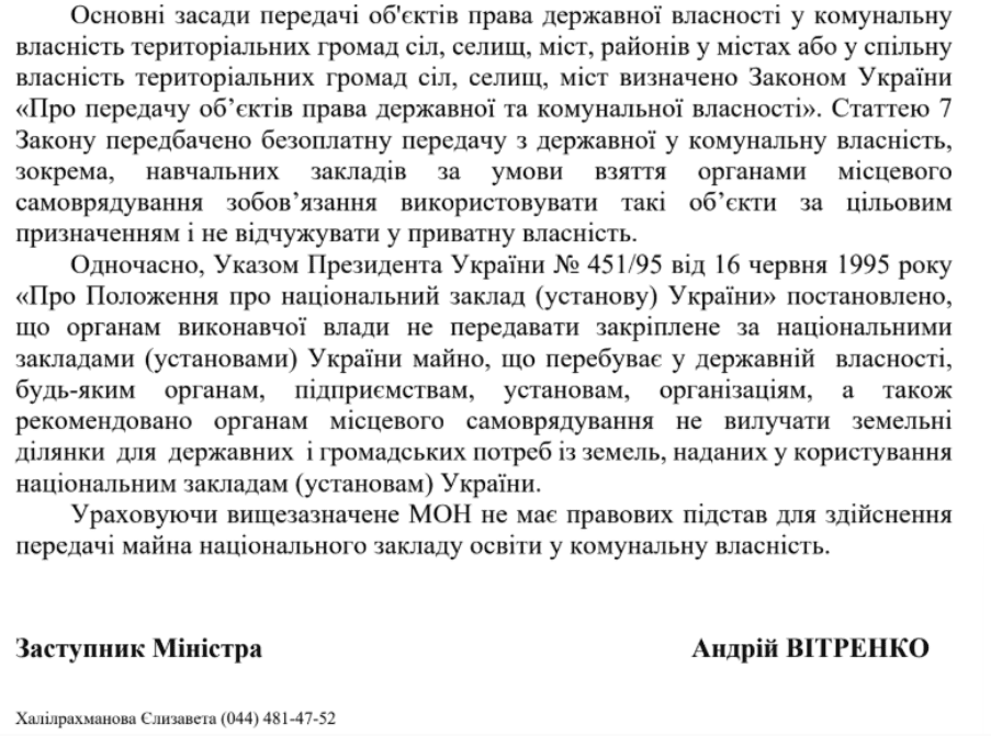 В офіційному листі Dnipro.media заступник Міністра Андрій ВІтренко повідомив, що МОН не має правових підстав передавати майно національного закладу освіти на баланс міста.