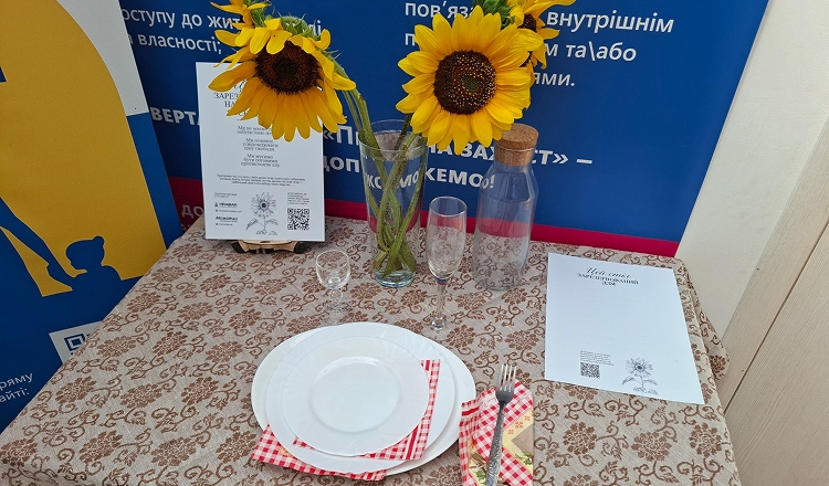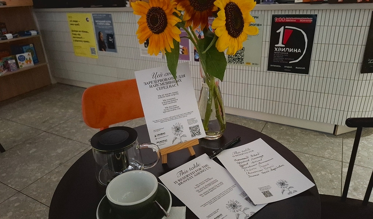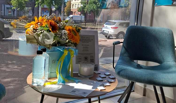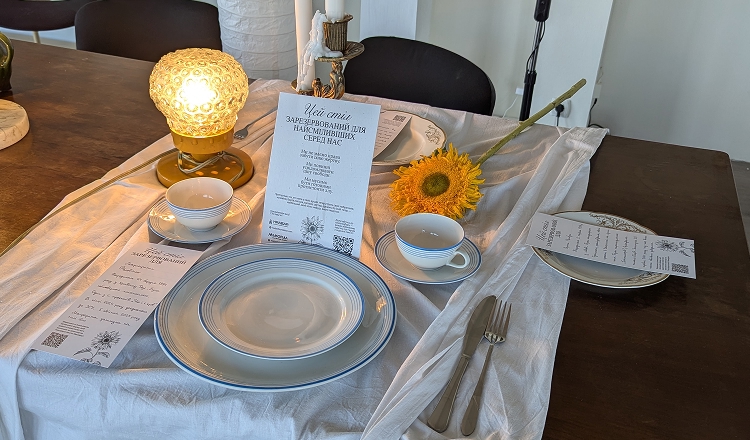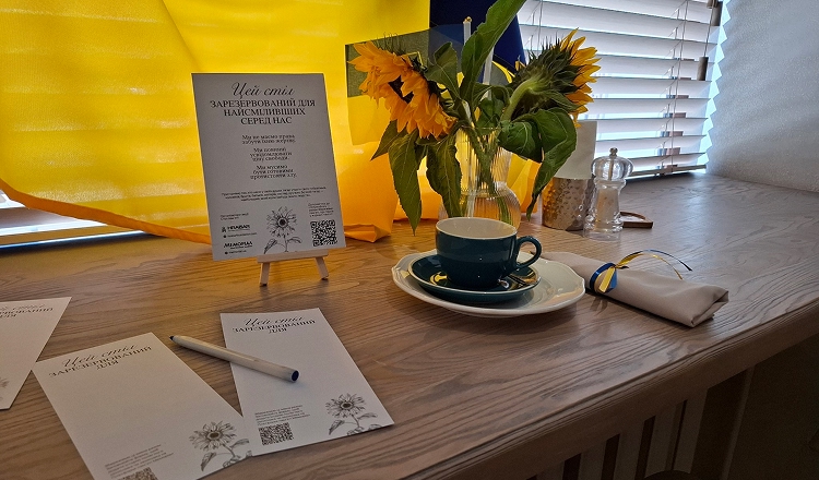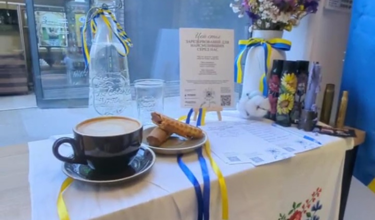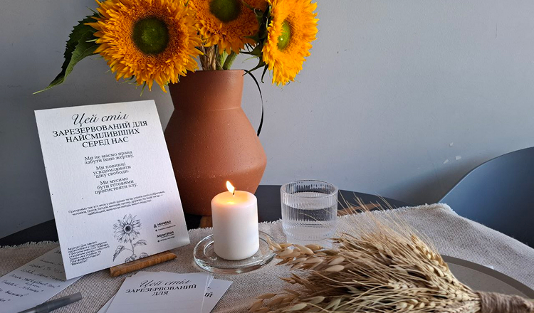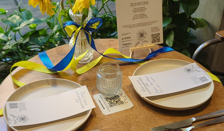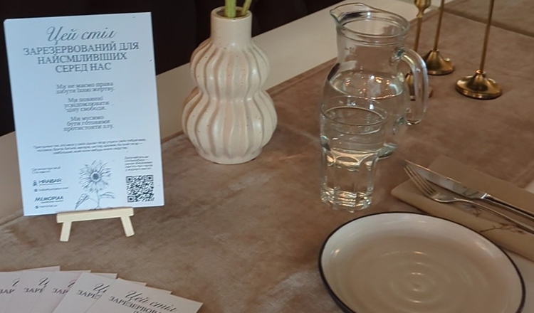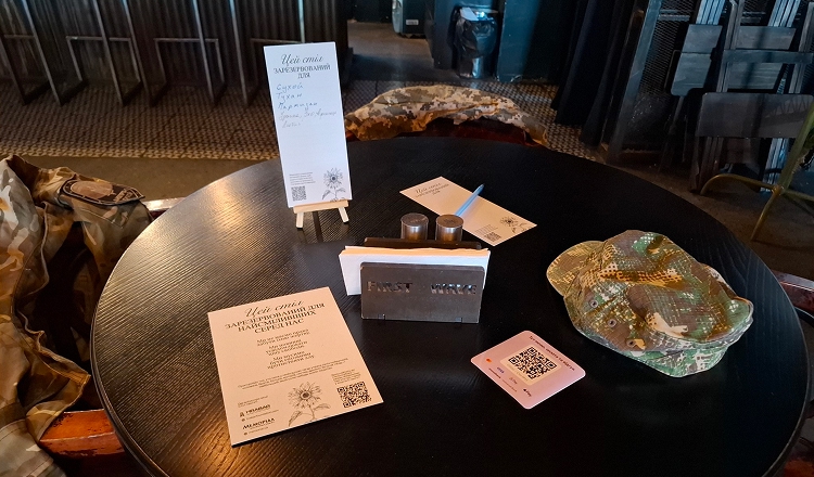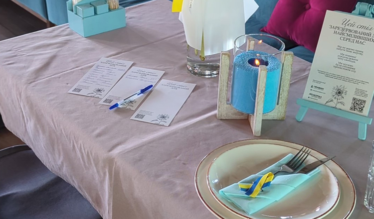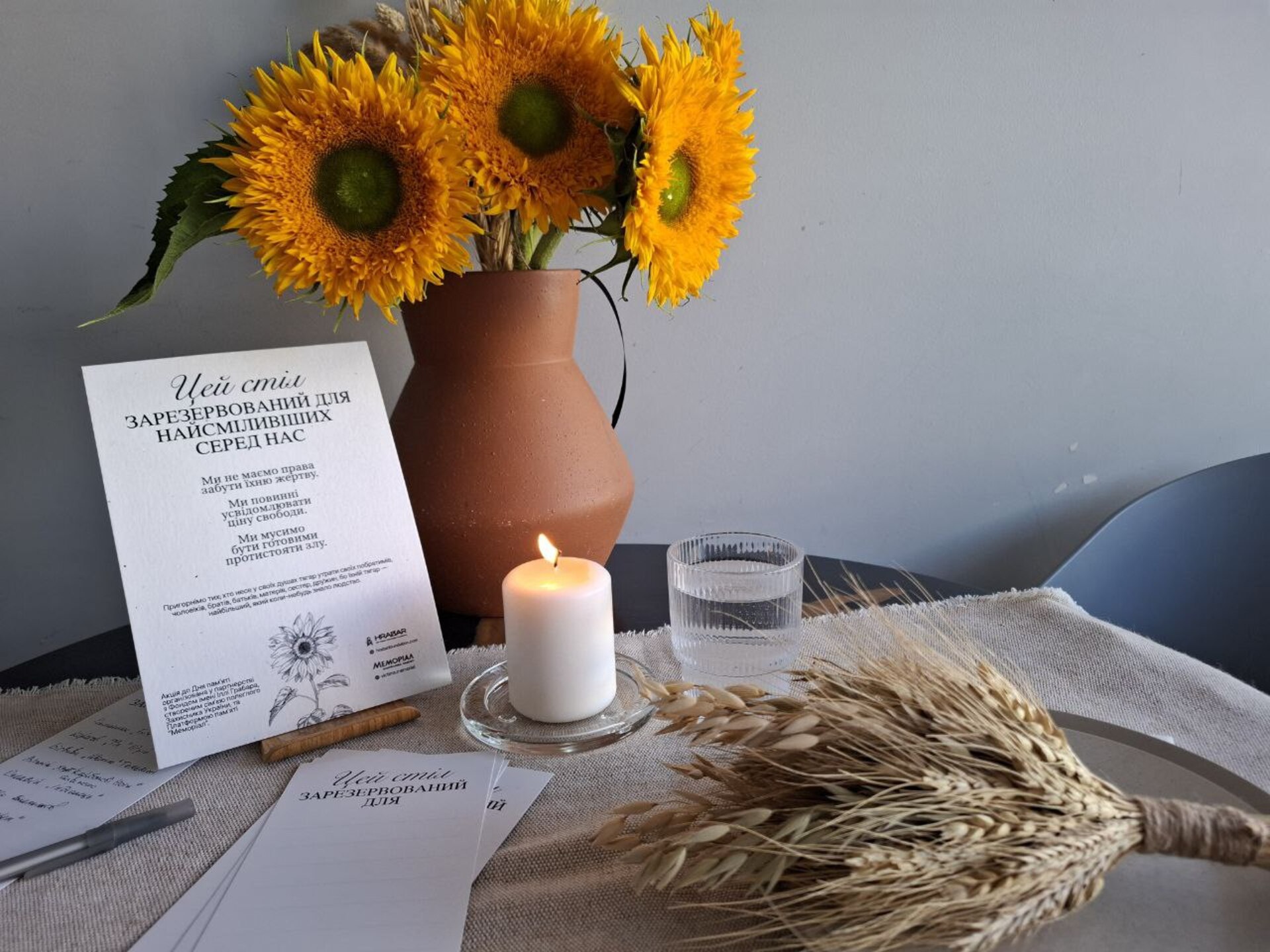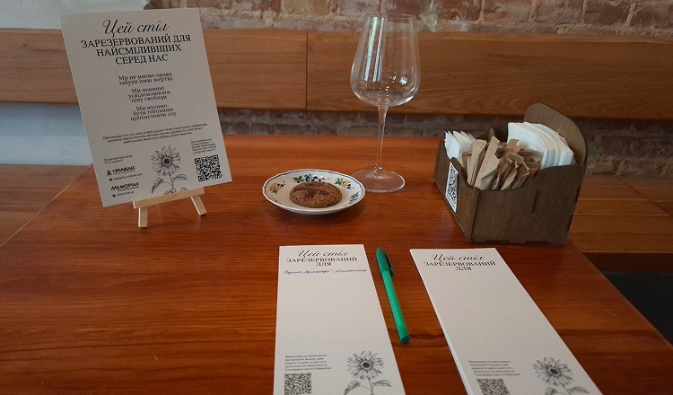 Заклад підготував «стіл на двох»: дві тарілки, на яких лежать листівки з іменами полеглих захисників України, два комплекти столових приладів, соняшники, жовто-блакитні стрічки та пам’ятка, яка пояснює для кого цей стіл сьогодні зарезервовано.