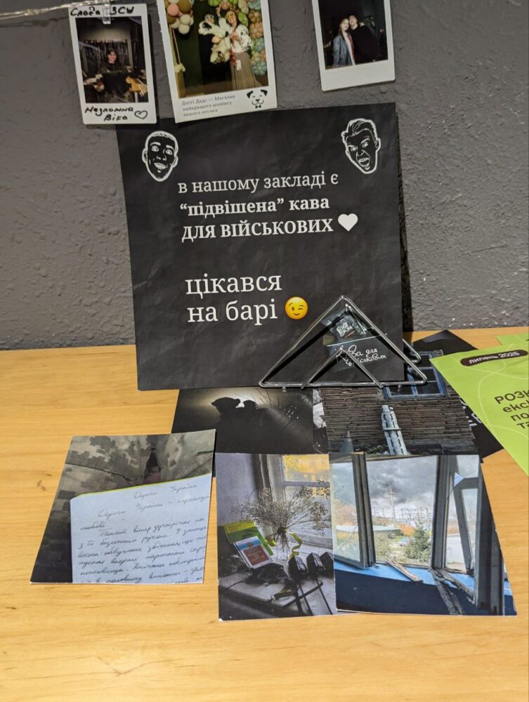 Також у кав’ярні існує можливість «підвісити каву» для військових, а для самих військовослужбовців отримати цю каву. Окрім цього на стінах кав’ярні висять плакати з ушанування пам’яті окремих полеглих захисників.